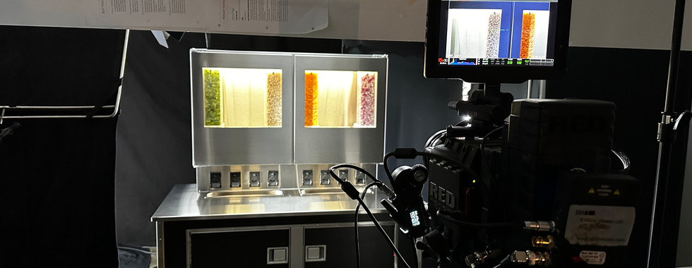 Out of the concepts we pitched them one became a clear winner. This video concept focused on showcasing the sleek machine and its features, while "making food safety sexy." That meant a focus on fresh food ingredients, while adding interest and movement with stop-motion and motion control elements. Whole crisp vegetables and healthy ingredients dance across the screen, then split apart, enter SerVue canisters, and get dispensed in healthy portions - all with plenty of color and action. Those in the know, understand how difficult filming food moving through space is. On top of that some shots called for the ingredients to split apart without human intervention. This was going to be a test of all our our creativity, as well as our video equipment capabilities.